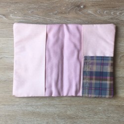 En tissu, format 14x19cm, avec poches intérieures dont une fermant à scratch pour mettre les médicaments par exemple.